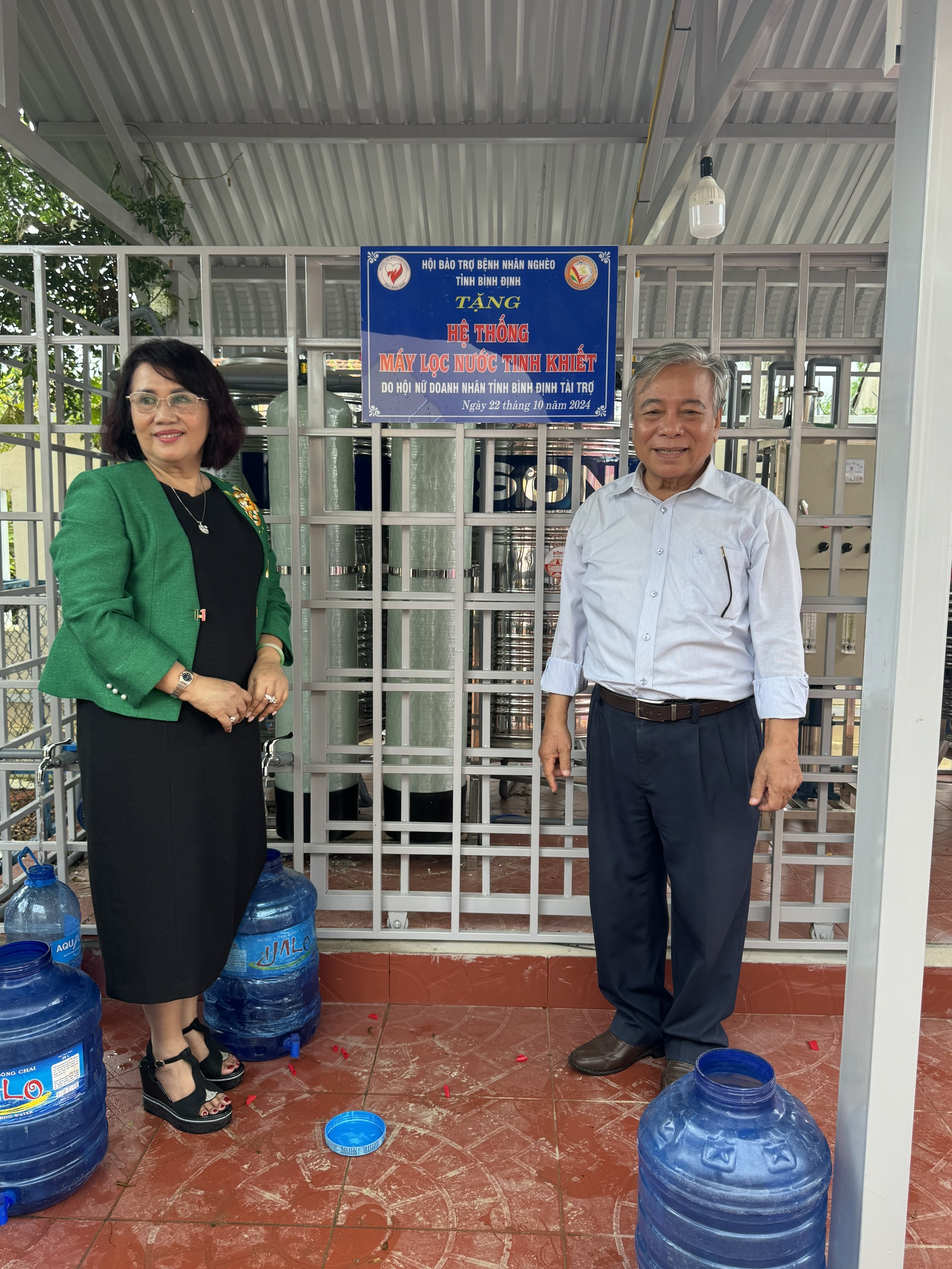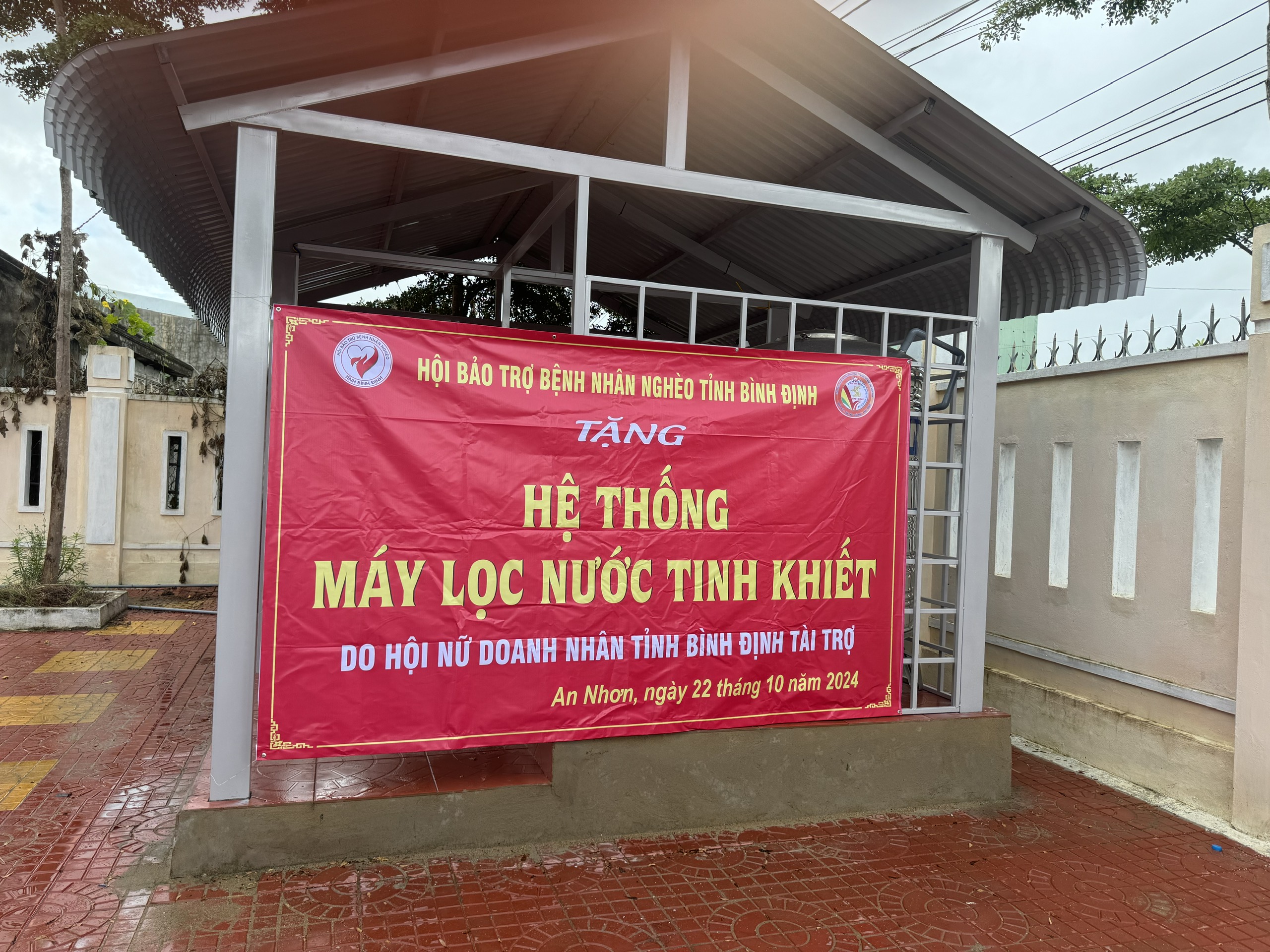 Sáng ngày 22/10/2024, Hội Nữ doanh nhân tỉnh Bình Định phối hợp với Hội bảo trợ bệnh nhân nghèo tổ chức bàn giao 2 Hệ thống máy lọc nước tinh khiết cho 2 cộng đồng dân cư thuộc thôn Tân Dân và thôn Tân Dương, xã Nhơn An, thị xã An Nhơn để cung cấp nước tinh khiết miễn phí cho người dân vùng nước bị ô nhiễm (máy có công suất 250 lít giờ), với sự tài trợ của Hội Nữ doanh nhân Bình Định và ngân sách đối ứng của địa phương làm mái che và chi phí vận hành.
