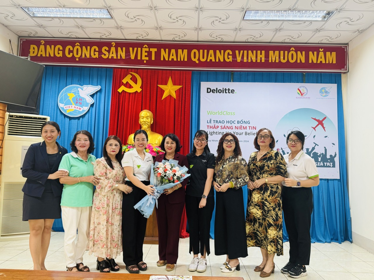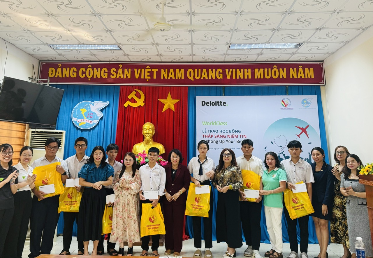 Chiều ngày 28/5/2024, được sự tài trợ của Quỹ học bổng Thắp sáng niềm tin của Deloitte Việt Nam, Hội Nữ doanh nhân tỉnh phối hợp với Hôi LHPN tỉnh tổ chức trao học bổng cho trẻ em học sinh cấp 3 có hoàn cảnh nghèo, mồ côi đang gặp khó khăn trong cuộc sống tại tỉnh Bình Định.